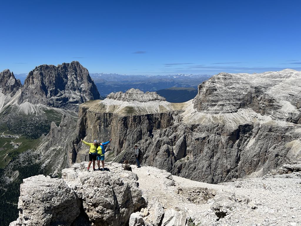 Börja med att ta buss från Val Gardena upp till Passo Sella och starta gärna med den roliga telefonkioskheisen (du blir “dyttad” in i en hiss i fart och åker upp till toppen). Härifrån tar du dig upp till Toni Demetz-hytta, cirka 2700 meter över havet, där du står mellan de mäktiga topparna Sassolungo/Langkofel och Sassopiatto/Plattkofel.