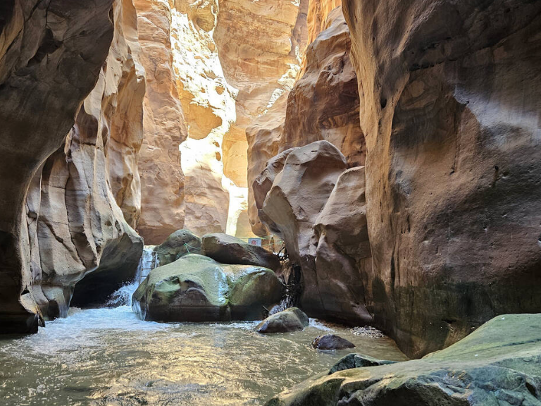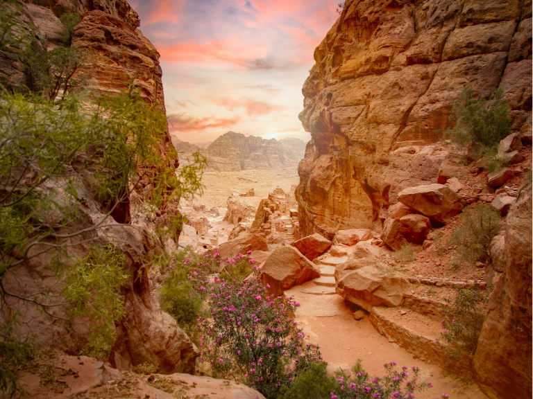 Senare beundrar vi Al-Khazneh, Petras mest kända fasad, skickligt uthuggen i klippans sida och nästan 40 meter hög – en plats som säkert får dig att tappa hakan. Vandringen avslutas genom den magnifika slot-canyonen Siq, stadens huvudingång, innan vi fortsätter till besökscentret där dagens resa rundas av.