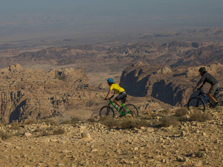 Vi börjar på cirka 1600 meters höjd och följer en behaglig nedförsbacke mot byn Toghra, där asfalten möter grusvägen. Dagens cykeltur tar oss sedan off-road på en lång nedförsbacke mot Wadi Rum, följt av en platt, trevlig sträcka på hård sand i den vidsträckta öknen.
